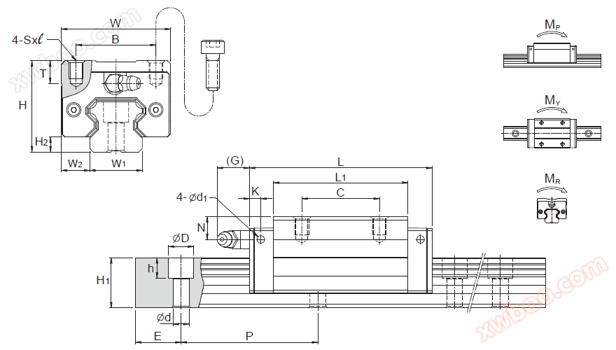| Numer modelu | Rozmiar szyny (mm) | Obciążenie nominalne podstawowe | Dopuszczalny moment statyczny | Waga | ||||||||||
